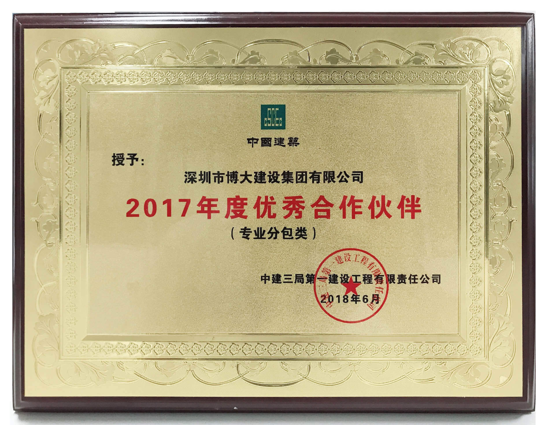 博大榮譽 | 中建三局一公司2017年度優秀合作伙伴